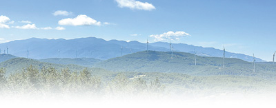 沿着刚铺好不久的柏油路驱车上山,不时可以从绿树掩映间看到远处的白色风机,巨大的风机叶片迎风转动,周围的树冠也随风摆动。