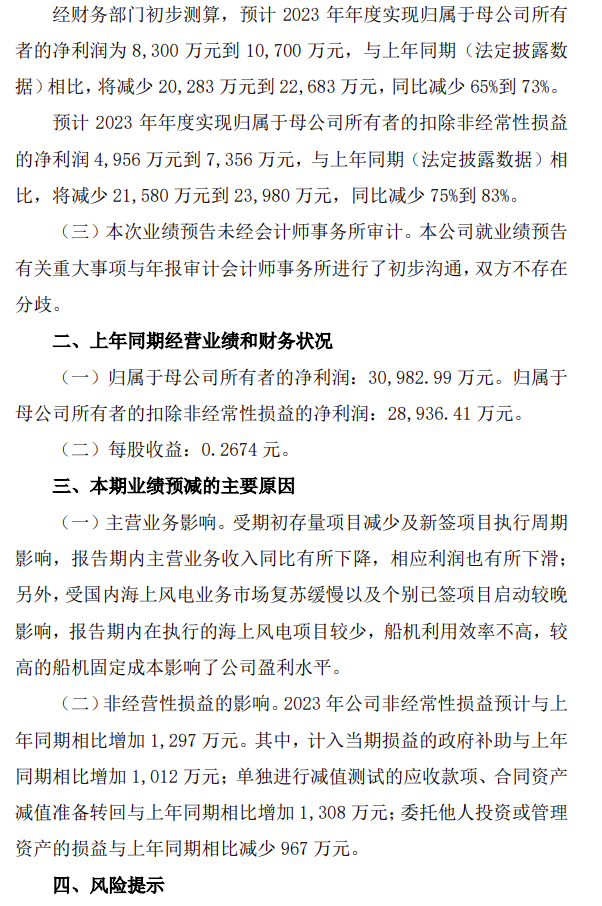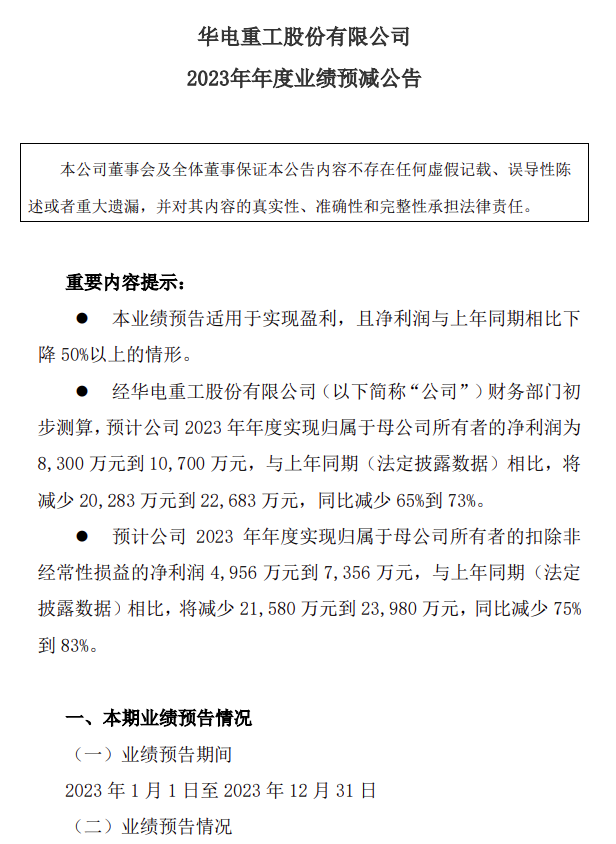 根据公告显示,经华电重工股份有限公司财务部门初步测算,预计华电重工2023年年度实现归属于母公司所有者的净利润为8,300万元到10,700万元,与上年同期(法定披露数据)相比,将减少20,283万元到 22,683万元,同比减少65%到73%。