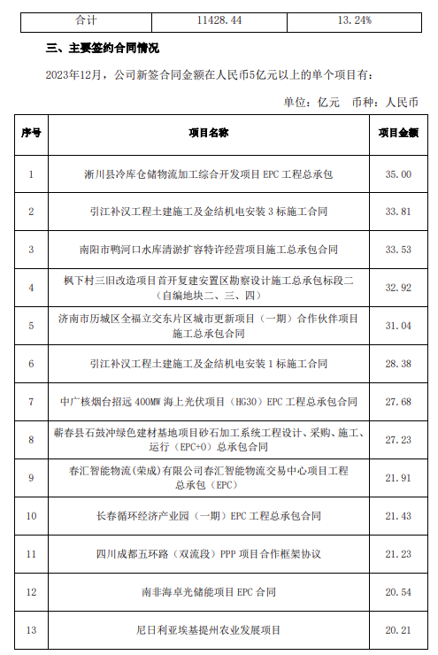 全年合计新签项目数量8217个,新签合同金额11428.44亿元,同比增加13.24%。