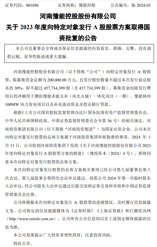 近日,豫能控股发布关于2023年度向特定对象发行A股股票方案取得国资批复的公告。