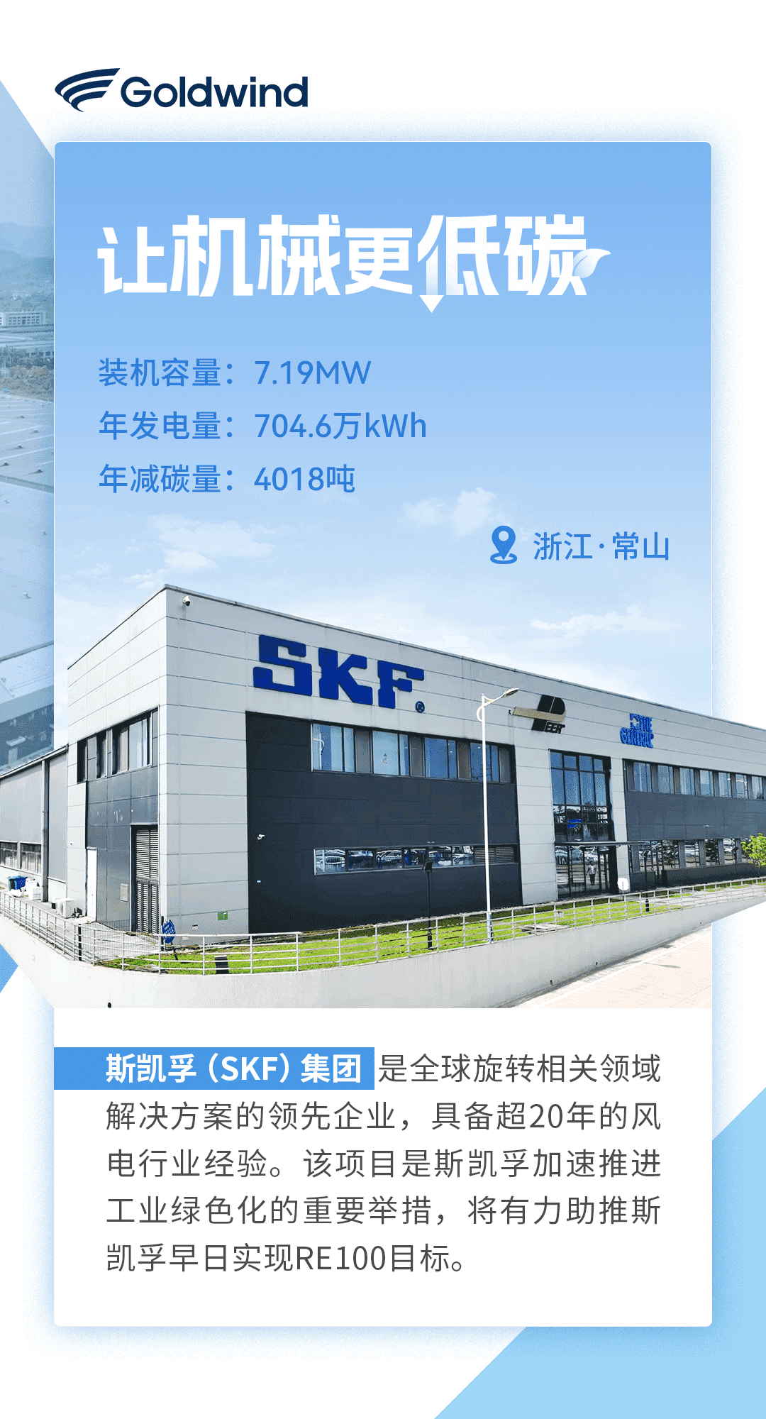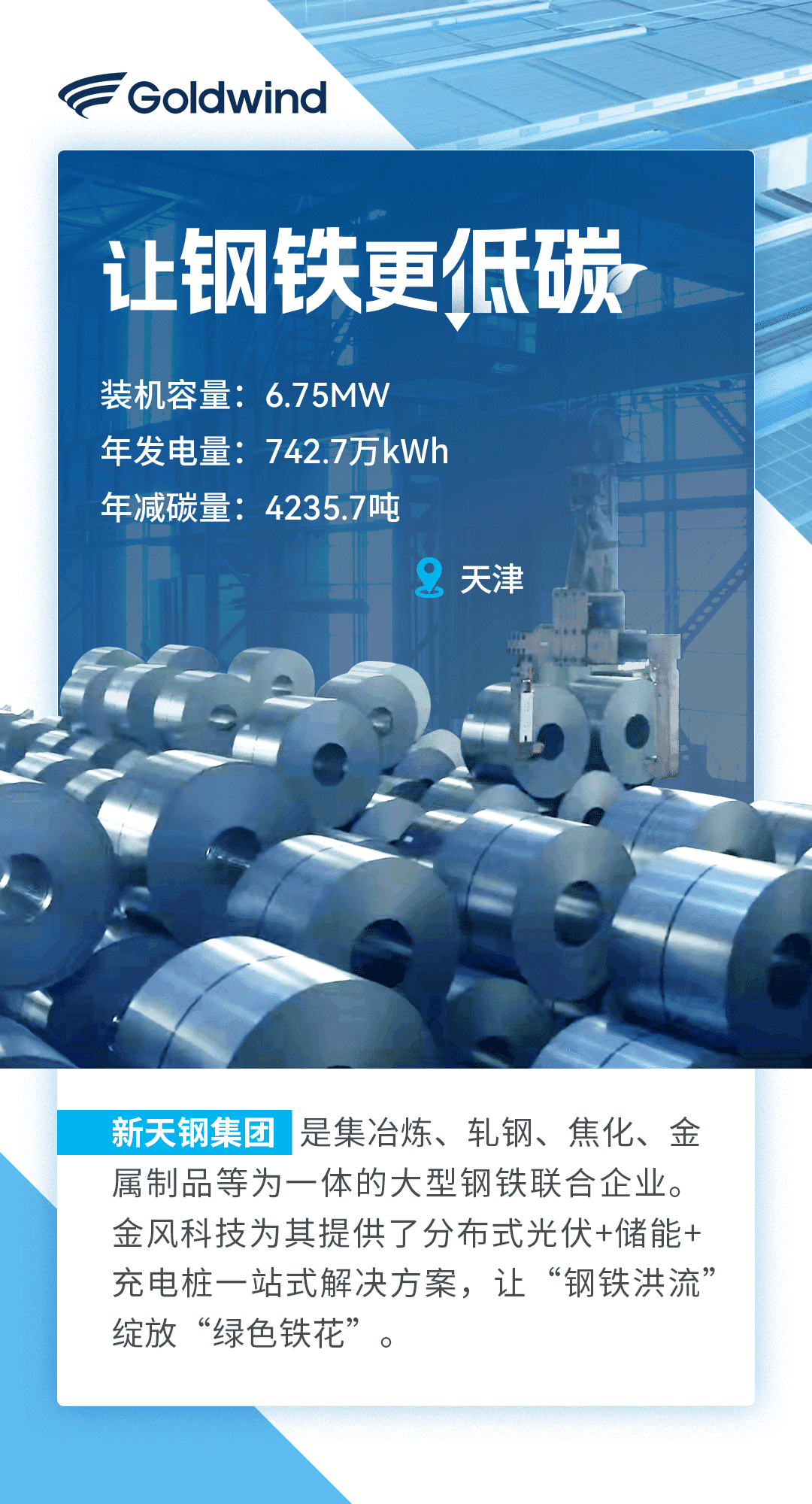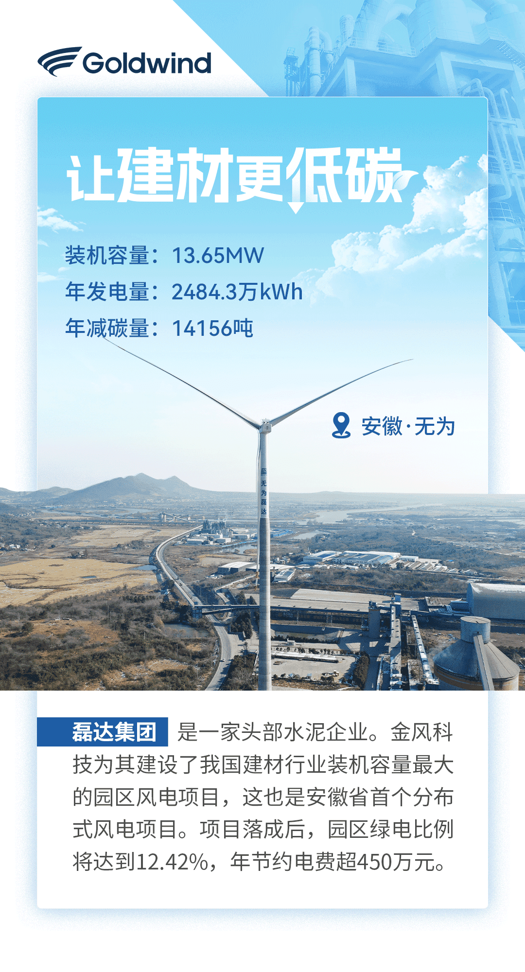 2023年,金风科技助推近10个零碳园区顺利落地,帮助来自钢铁、化工、机械等行业的知名企业实现低碳生产。通过绿色发电装备与金风科技能碳管理平台的组合式解决方案,助力工商业合作伙伴与全社会携手奔向“碳中和”。