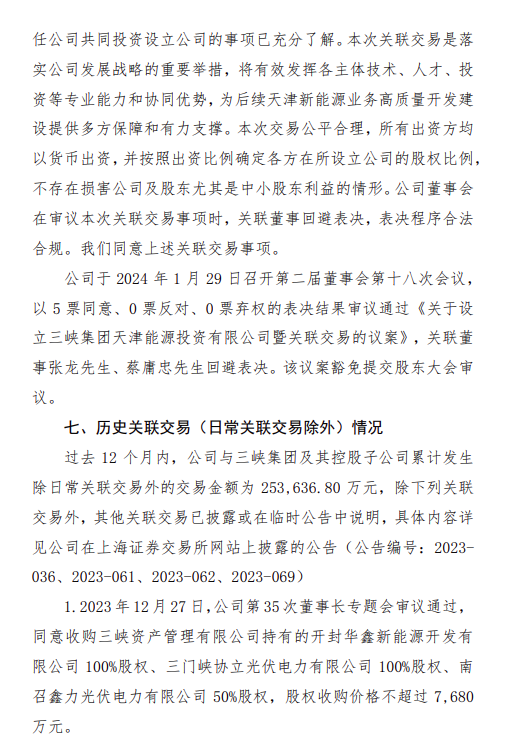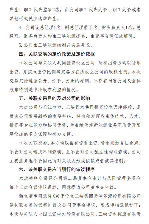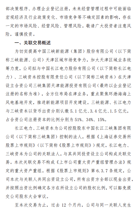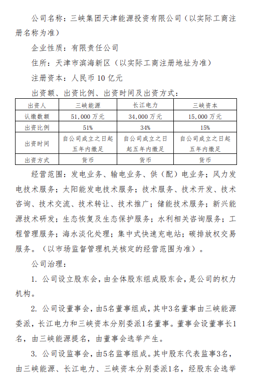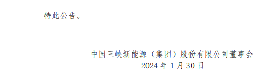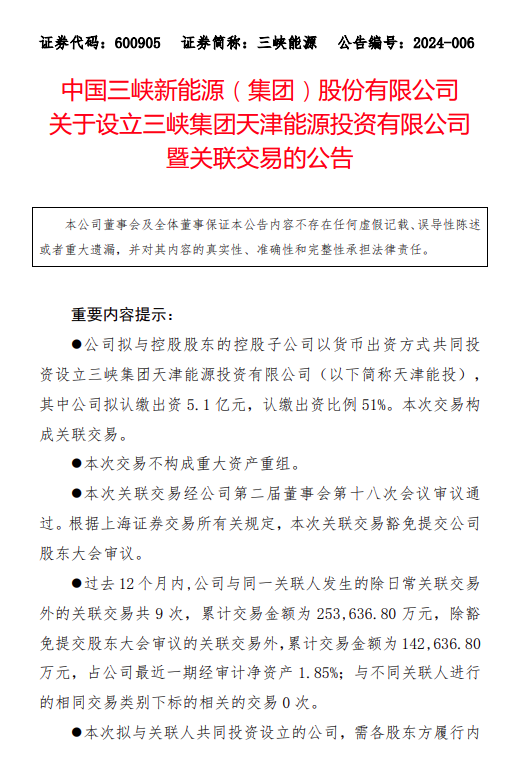 1月30日,三峡能源发布《中国三峡新能源(集团)股份有限公司关于设立三峡集团天津能源投资有限公司暨关联交易的公告》。