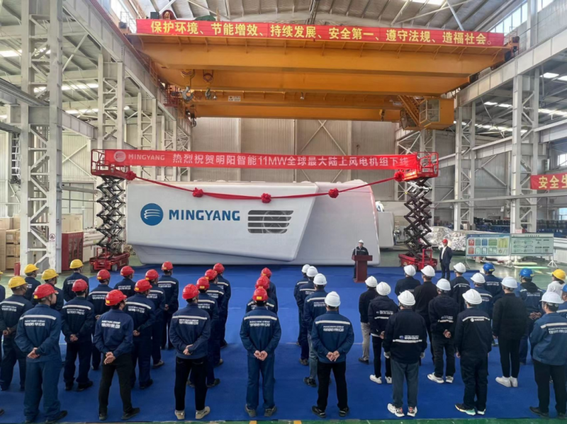 MySE11-233陆上11兆瓦风力发电机组由明阳智能自主研发,锡市明阳新能源制造,该机型是针对“沙戈荒”风电大基地极端条件研发的旗舰机型,是目前全球已下线单机容量最大、风轮直径最大的陆上风电机组。该机型采用先进热管理技术和高效免维护滤沙等先进技术,并采用机舱旋风除尘设计,高效匹配沙漠、戈壁、荒漠环境。机组搭载Flexible Power 平台化设计,具有灵活拓展、区域覆盖广、适应性强等特点,风轮直径可由233米向上延伸至243米,塔筒高度范围达130至200米。该设计使得机组运行更高效,其拥有42000平方米扫风面积,相当于6个标准足球场,满发情况下1天发电量可满足约1300个家庭1个月的用电需求。