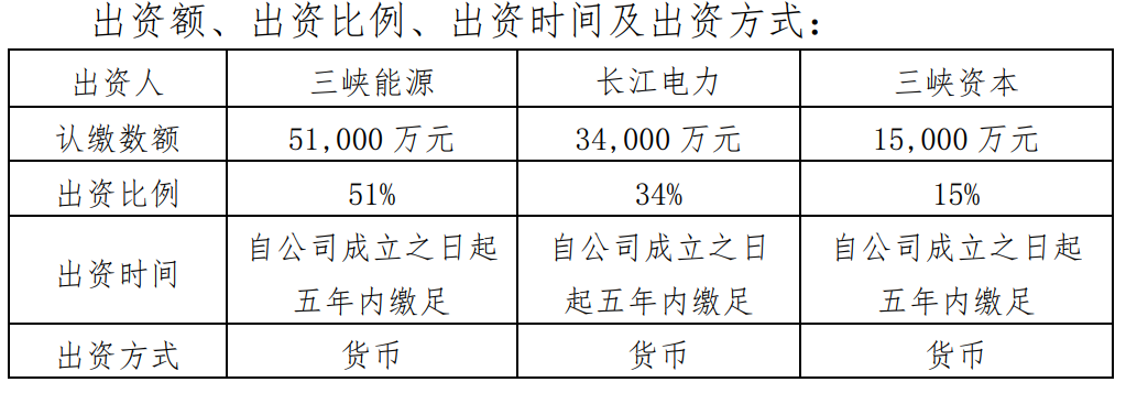 公告披露,为切实提高三峡能源天津区域市场竞争力,加大天津区域业务统筹力度,公司拟与中国长江电力股份有限公司(以下简称长江电力)、三峡资本控股有限责任公司(以下简称三峡资本)在天津设立合资公司三峡集团天津能源投资有限公司(最终以企业登记注册的名称为准),全方位布局在津业务,重点聚焦环渤海海上风电基地开发,推进新能源项目开发建设。三峡能源、长江电力与三峡资本以货币出资分别认缴5.1亿元、3.4亿元、1.5亿元,占合资公司注册资本的比例分别为 51%、34%、15%。