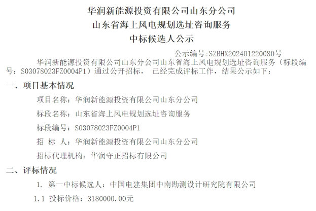 日前,华润集团发布《华润新能源投资有限公司山东分公司山东省海上风电规划选址咨询服务中标候选人公示》,公示显示,中国电建(5.030, -0.04, -0.79%)集团中南勘测设计研究院有限公司为第一中标候选人。