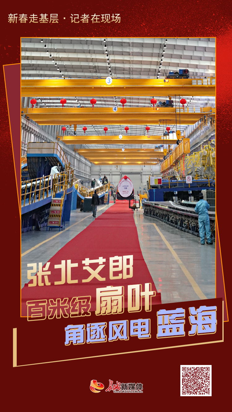 1月29日,记者走进张北艾郎风电科技发展有限公司新厂区,灌注、冲压、冷却、打磨、吊装……工人们正紧锣密鼓地赶制着春节前的订单,运送材料的“平衡车”往来穿梭,这里不到10天时间,就会有一组风电叶片完成下线。让记者眼前一亮的,无疑是刚刚全新下线的华北地区首支108米的大功率风电叶片,让人一眼望不到边,立起来有33层楼高,能够同时容纳260多个成年人并排站在上面。
