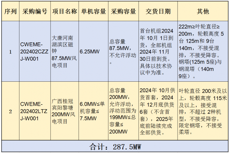 其他:叶轮直径 200米及以上,轮毂高度 115米及以上,接受混排,不超过 2种机型,不接受降容,限定钢塔,不接受柔塔。