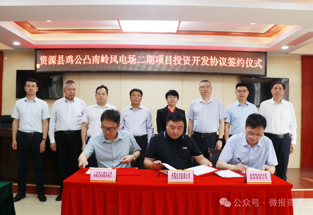 4月3日,广西壮族自治区桂林市资源县举行鸡公凸南岭风电场二期项目投资开发协议签约仪式。仪式上,资源县丹霞生态能源有限公司与东方绿色能源(河北)有限公司、资源电投绿合新能源有限公司,广东宝仁建设工程有限公司签订资源县鸡公凸南岭风电场二期项目投资开发协议。据悉,资源县鸡公凸南岭风电场二期项目位于资源县中峰镇,总装机容量是15万千瓦,总投资约12亿,项目全容量投产后年产值达1.2亿,创税约3000万元,项目落地后将为资源县经济社会高质量发展增添绿色动力。