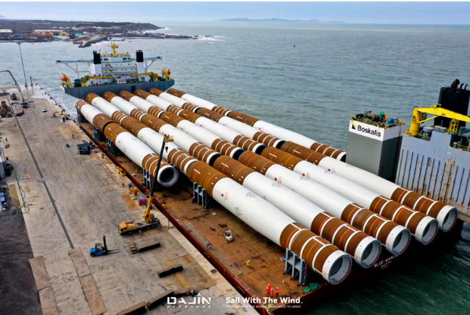 近日, 由大金重工独家供货的法国496MW NOY-lles D'Yeu et Noirmoutier海上风电项目第二批次20根单桩在蓬莱大金港完成装船,启航发运法国。