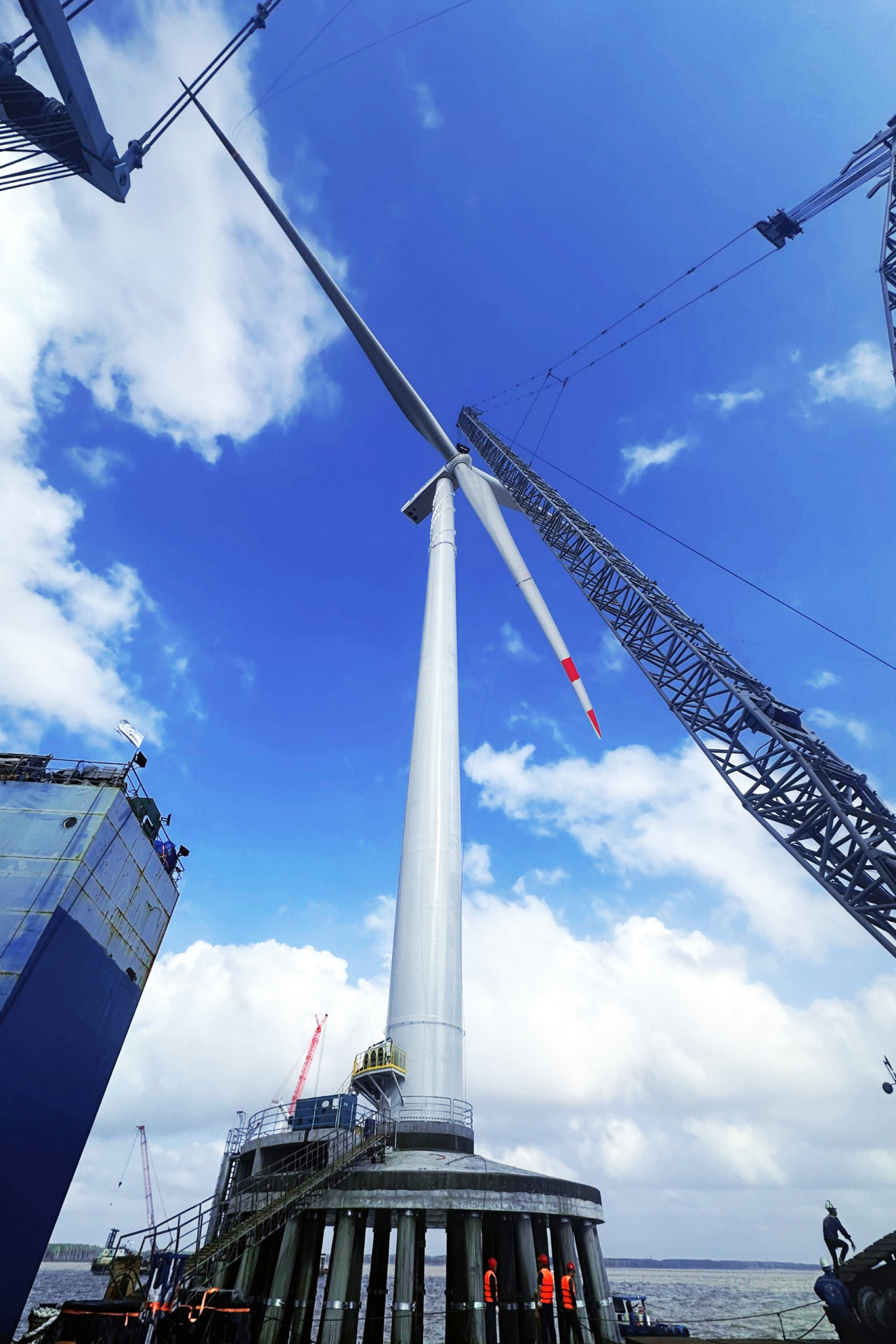 项目吊装期间,越南海域进入大风季,阵风最大可达17米/秒,浪高达到2米,本来施工窗口期就短,再加上海上风电机组塔内设备较陆上机组多,首段塔筒需在陆地上完成预组装,直立运输到机位,在超高、超重情况下,运输吊装难度可谓直线上升。
