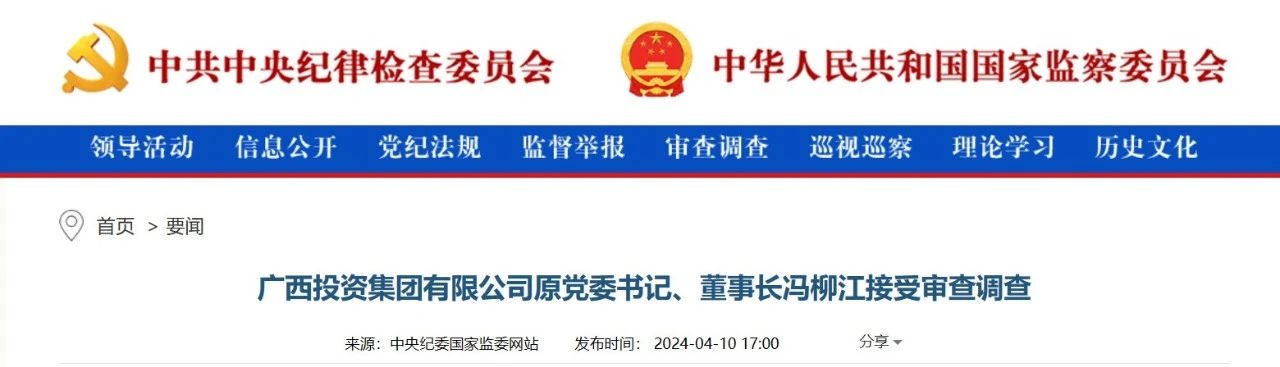 中央纪委国家监委网站4月10日消息,据广西壮族自治区纪委监委消息:广西投资集团有限公司原党委书记、董事长冯柳江涉嫌严重违纪违法,目前正接受广西壮族自治区纪委监委纪律审查和监察调查。