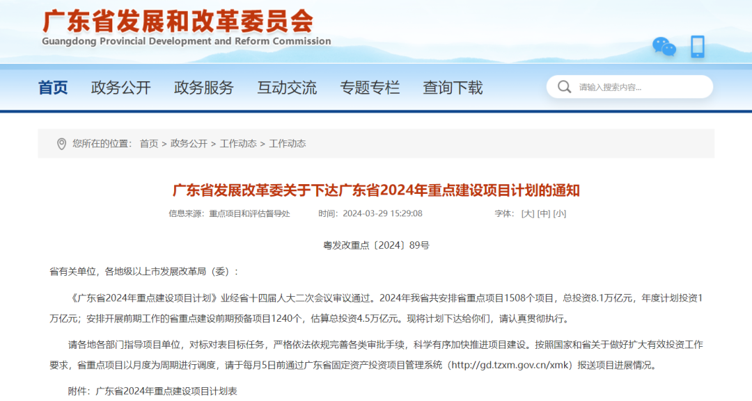 根据《通知》,《广东省2024年重点建设项目计划》业经省十四届人大二次会议审议通过。2024年广东省共安排省重点项目1508个项目,总投资8.1万亿元,年度计划投资1万亿元;安排开展前期工作的省重点建设前期预备项目1240个,估算总投资4.5万亿元。