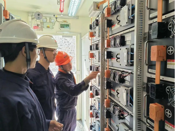 图为工程师正在巡视储能电池仓