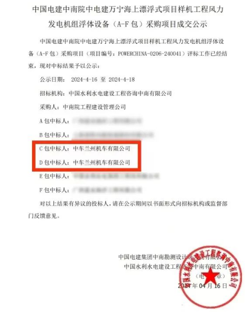 4月16日,中车兰州公司中标中电建海南万宁项目两台海上风电漂浮式平台,合同金额约2亿元。标志着公司向深远海风电装备制造及高质量发展进程迈出了具有重大意义的一步。