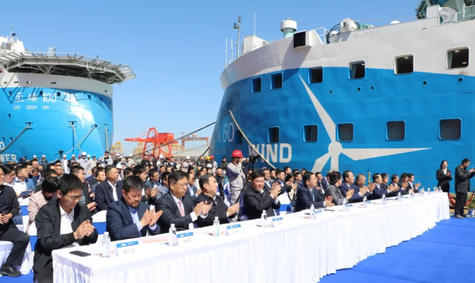 交船仪式上,由上海振华重工党委副书记、总裁欧辉生,盐城市副市长、滨海港工业园区党工委书记高尚德,南通市副市长李玲,海力风电总经理兼立洋海洋工程有限公司董事长沙德权发表讲话。