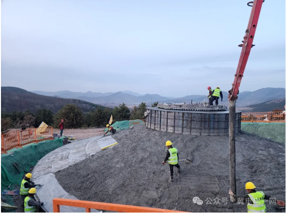 凌晨5点08分第一罐混凝土开始浇筑,施工过程中安全措施到位,警示宣传标语齐全,消防设施齐全,所有进入现场人员安全防护措施严格执行。施工工序交接紧密有序,罐车通道协调顺畅,混凝土浇筑不间断全程保障,人员施工配合有条不紊。施工质量严格把控,混凝土配合比、坍落度、施工工艺按照标准严格执行。管理人员及施工人员在现场坚守岗位,不怕困难,遇到问题多方协调沟通,经过共同努力,晚上8点浇筑完成,晚上11点收面完成,首台风机基础顺利浇筑完成。