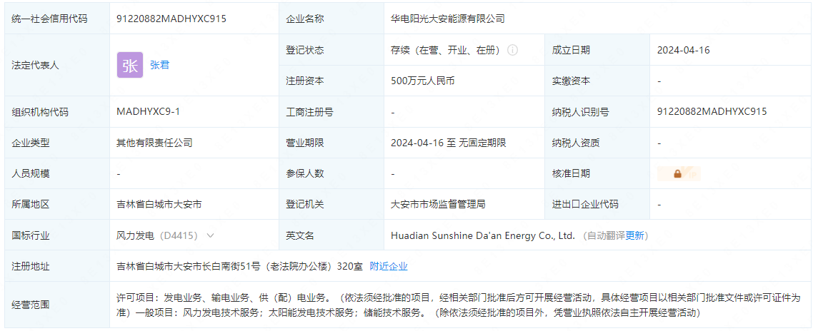 近日,华电阳光大安能源有限公司成立,法定代表人为张君,注册资本500万人民币,经营范围含发电业务、输电业务、供(配)电业务、风力发电技术服务、太阳能发电技术服务、储能技术服务。