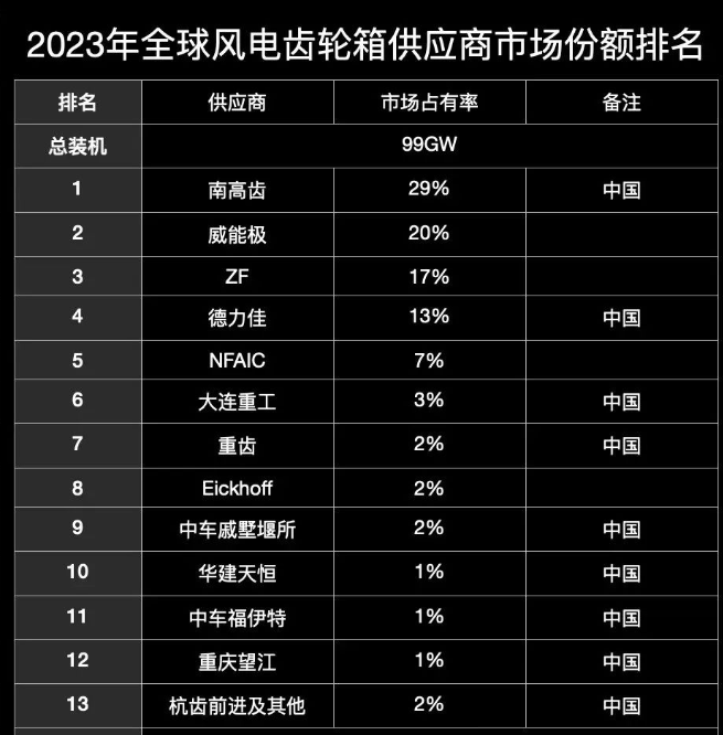 据统计,2023年全球风电齿轮箱制造商市场占有率排名前三的是南高齿、威能极、ZF,第4-10名依次为德力佳、NFAIC、大连重工、重齿、Eickhoff、中车戚墅堰所、华建天恒。全球前十中,中国占据6席。