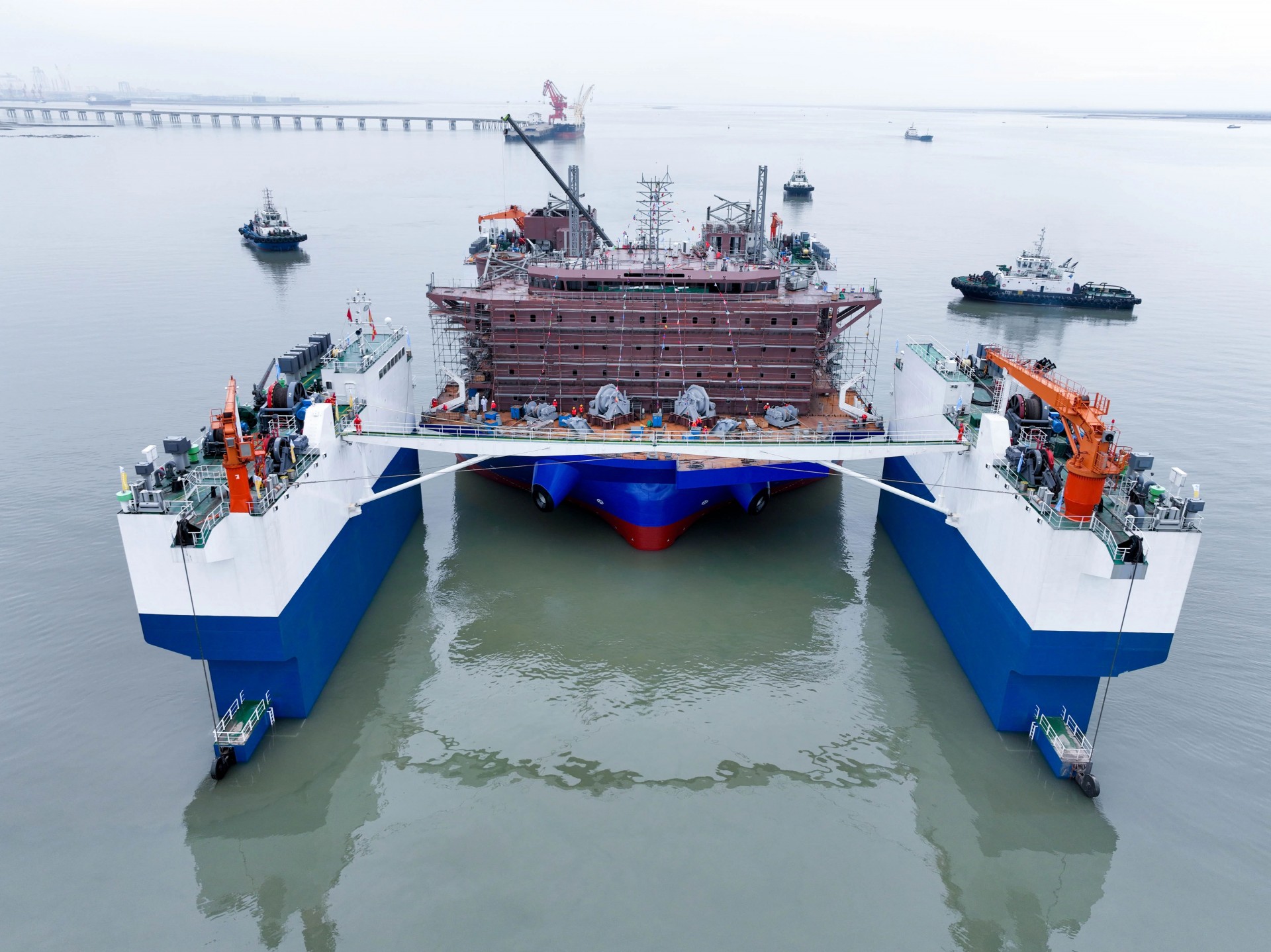 4月23日上午,中国船舶武汉船机与江苏大津重工联合为天津港航工程有限公司建造的1800吨自航自升式风电安装平台在通州湾建造基地顺利下水。