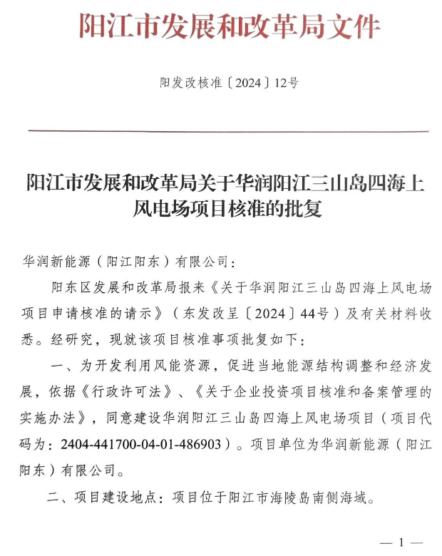 4月25日,华润电力广州公司阳江三山岛四海上风电项目获得阳江市发展和改革局核准批复,项目规划装机容量500MW,位于广东省阳江市三山岛南部海域,是公司首个核准的海上风电项目。