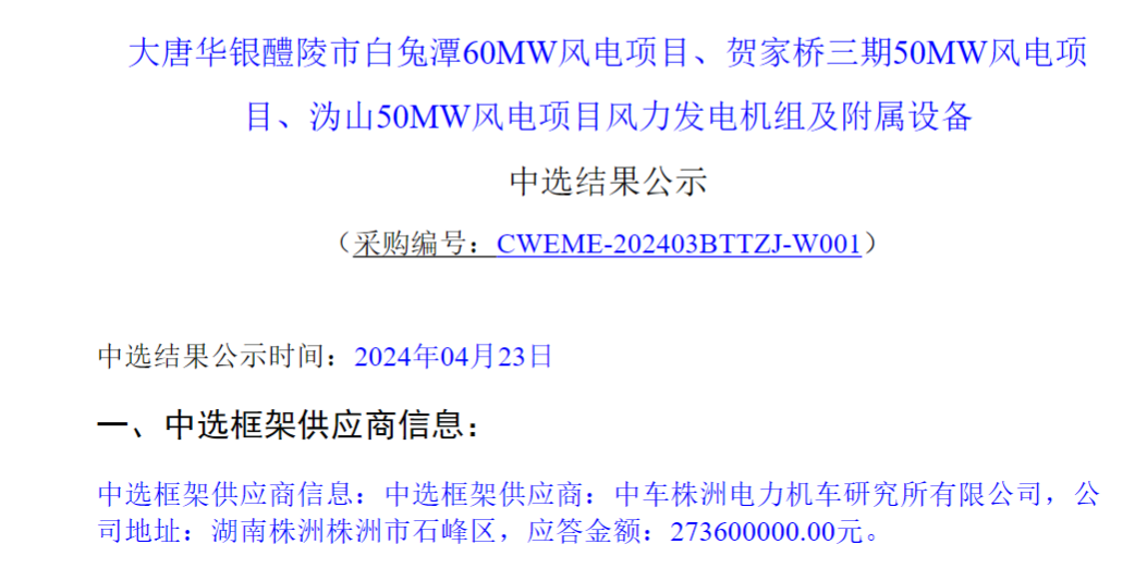 中车株洲电力机车研究所有限公司成功中标大唐华银醴陵市白兔潭60MW风电项目、贺家桥三期50MW风电项目、沩山50MW风电项目,中标价格为273600000.00元。