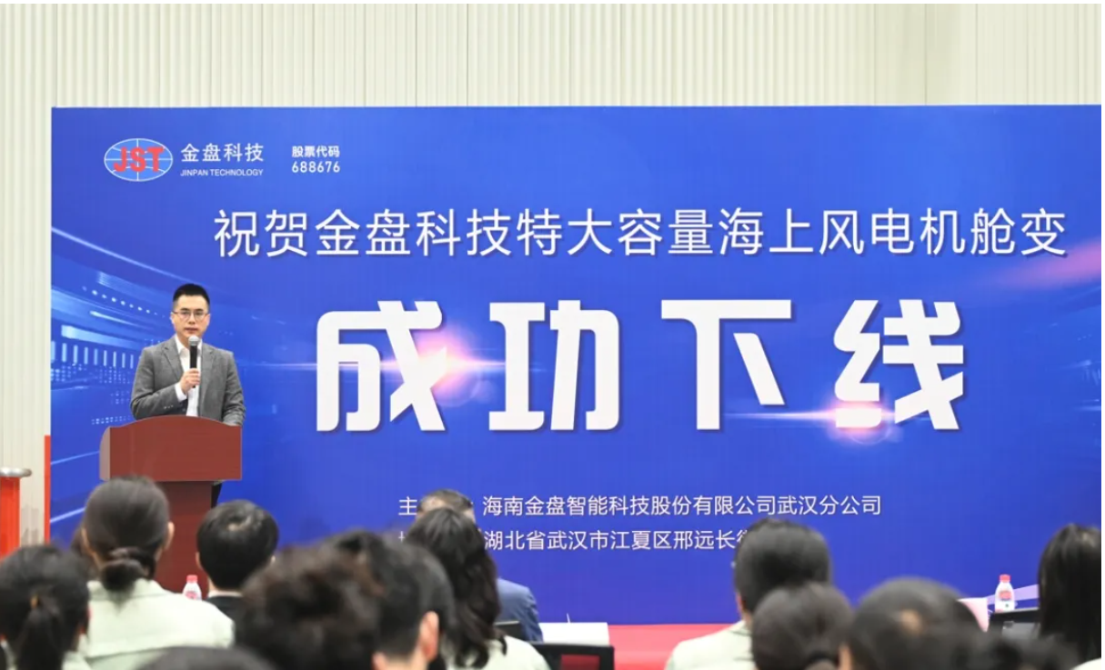 在产品下线仪式上,金盘科技董事长李志远先生、境外子公司总裁靖宇清女士、公司副总经理邸双奎先生、智能科技研究总院院长耿潇先生共同为公司 20+MW 等级大容量海上风电机舱变产品揭幕。