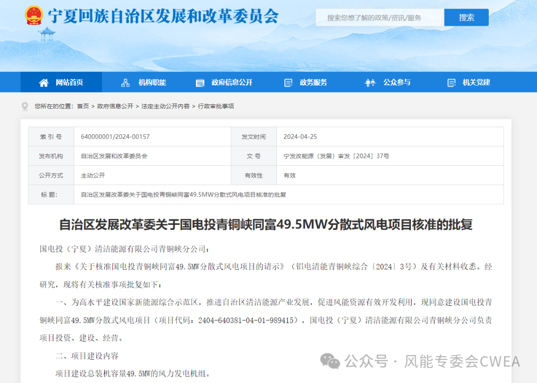 青铜峡同富49.5兆瓦分散式风电项目位于青铜峡市树新林场,总投资约2.32亿元。项目建成后预计每年可为电网提供清洁电能11119.68万千瓦时,可节约标准煤约3.39万吨,可减少二氧化碳排放量约9.25吨、二氧化硫排放量约17.79吨、氮氧化物排放量约19.9吨。国电投(宁夏)清洁能源有限公司青铜峡分公司需在项目开工前,依据相关法律、行政法规规定办理安全生产、环评等相关手续,手续不全,不得开工建设。在项目建设过程中,要严格执行各项安全规定,减少生态环境影响。