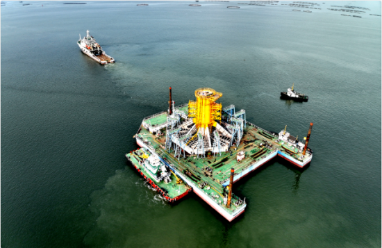 4月29日下午15:00,该基础完成了基础起浮工作,并与大连港湾公司参与研制的世界首创筒形基础专用浮运平台“天河长龙南方号”进行绑扎封固。
