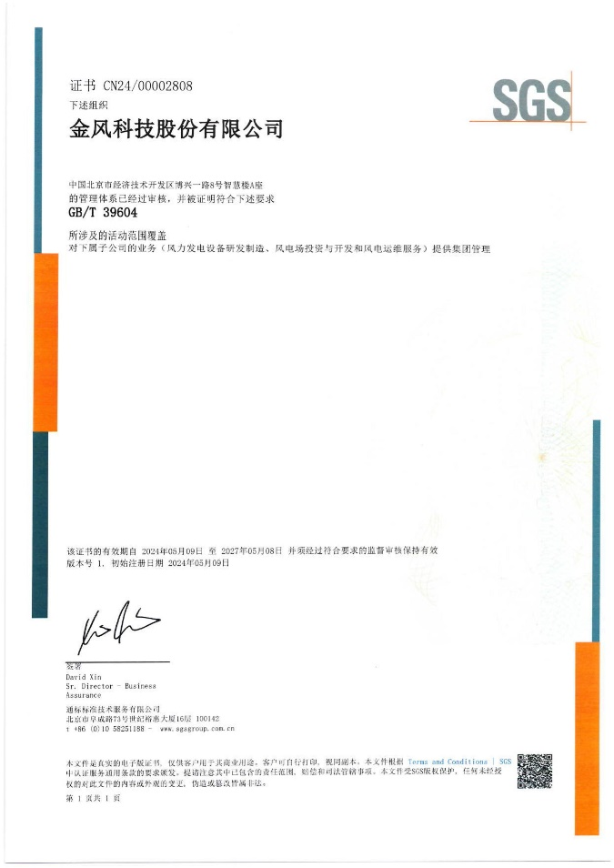 近日,金风科技获得社会责任管理体系国家标准《社会责任管理体系 要求及使用指南》(GB/T 39604-2020)认证证书,成为风电行业第一家获得此认证证书的企业。该证书由通标标准技术服务公司(SGS)颁发。