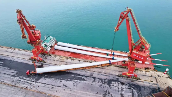 两家单位提前布局,统筹协调多方联动,量身定制运输和吊装等作业方案,反复优化装卸工艺,确保叶片启运、港口装卸、堆存中转,以及确定海上机位等各环节的有效衔接。