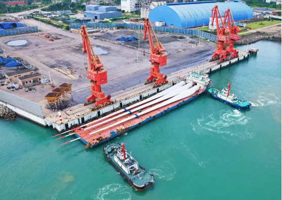 5月25日,随着“柒跃21”轮运载的叶片单件顺利卸船,马村港三期散货码头完成了琼北地区首次海上风电项目叶片装卸作业。该项目也是物流公司在大型成套工程物流项目领域取得的新突破。