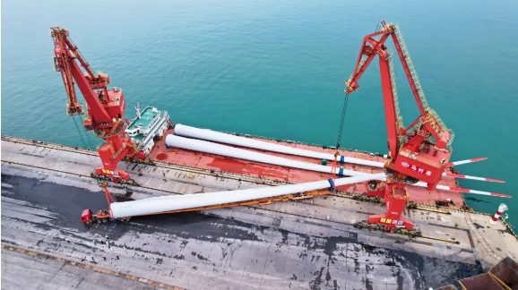 此次完成装卸作业的叶片单件长达118米,单件重量超50吨,为高效完成本次业务合作,物流公司和通用公司充分协同合作,积极发挥“航运—港口—物流”三位一体资源优势,分别提供定制化全过程物流服务和港口装卸及堆存服务。两家单位主动出击、提前布局,统筹协调多方联动,量身定制运输和吊装等作业方案,反复优化装卸工艺,确保叶片启运、港口装卸、堆存中转,以及确定海上机位等各环节的有效衔接。