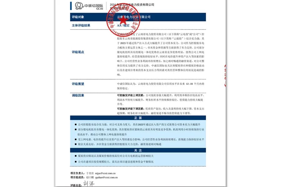 5月23日,云南省电力投资有限公司获得国内权威信用评级机构中诚信AA+主体信用评级,评级展望为稳定。