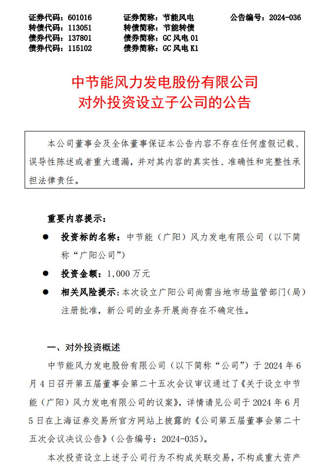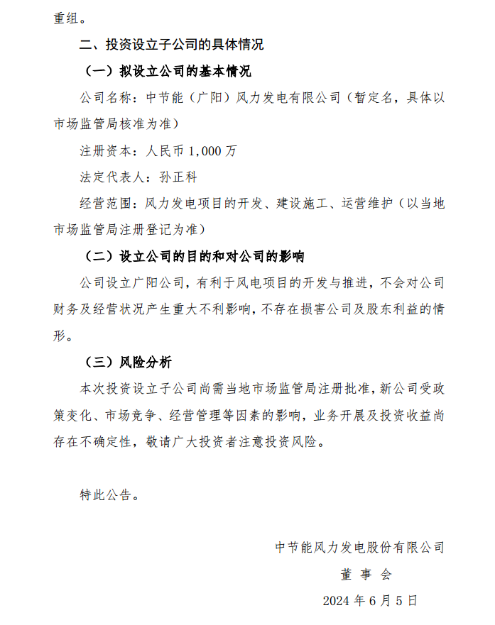 6月5日,节能风电发布对外投资设立子公司的公告。