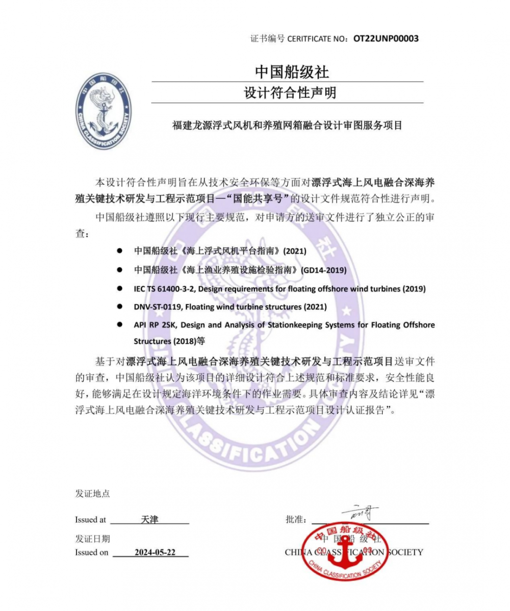 “国能共享号”风渔融合平台是深远海漂浮式风电与渔业养殖一体化设计概念在世界范围内的首次创新实践,有效利用海上风电机组下部海洋立体空间,在生产绿色能源的同时因地制宜开展渔业养殖,开创海上风电与渔业养殖融合发展的新模式。该平台的设计涉及多学科、跨行业关键技术,系统功能性强,技术挑战性大,包括渔业养殖、总体性能、结构、系泊、机械、电气等14个专业,形成设计文件多达300余套。认证过程中,中国船级社遵照国内外现行主要规范要求,对相关专业所有文件进行了全面严格、独立公正的审查,认为“国能共享号”的设计符合规范和标准要求,安全性能良好,能够满足规定海洋环境条件下的作业需要,最终完成设计认证并发布设计符合性声明。