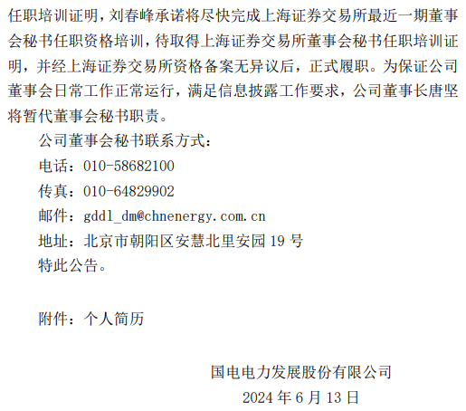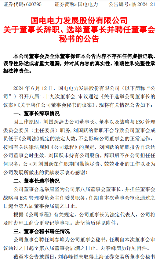6月12日晚间,国电电力发展股份有限公司(简称:国电电力)发布关于董事长辞职、选举董事长并聘任董事会秘书的公告。
