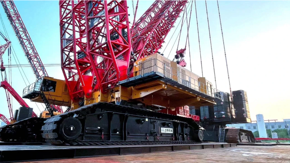 承担本次主吊任务的三一2000吨履带起重机,正是此前交付广东力特的SCC52000TM的部分体。SCC52000TM由一台2000吨和一台1600吨的履带起重机改装组合而成,是国内首台投产及应用的“二合一”履带起重机。最大起重量3000吨,可拆成2000t和1600t施工,主要满足石化罐体、核电穹顶等大型化吊装的需求。
