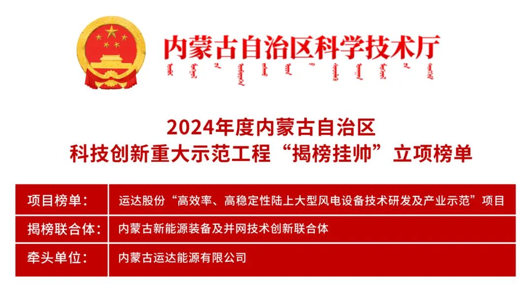 近日,2024年度内蒙古自治区科技创新重大示范工程“揭榜挂帅”立项榜单尘埃落定。经过各大顶尖团队的激烈角逐,运达股份“高效率、高稳定性陆上大型风电设备技术研发及产业示范”项目脱颖而出,以其前瞻谋划和卓越设计成为此次评选中唯一揭榜的“风电帅旗”。