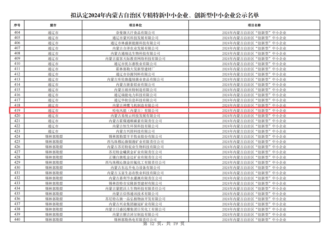 近日,哈电风能(内蒙古)有限公司(以下简称内蒙古公司)传来喜讯,继获得高新技术企业认定后,又成功申报创新型中小企业,其在创新领域的卓越实力获得专业认可。