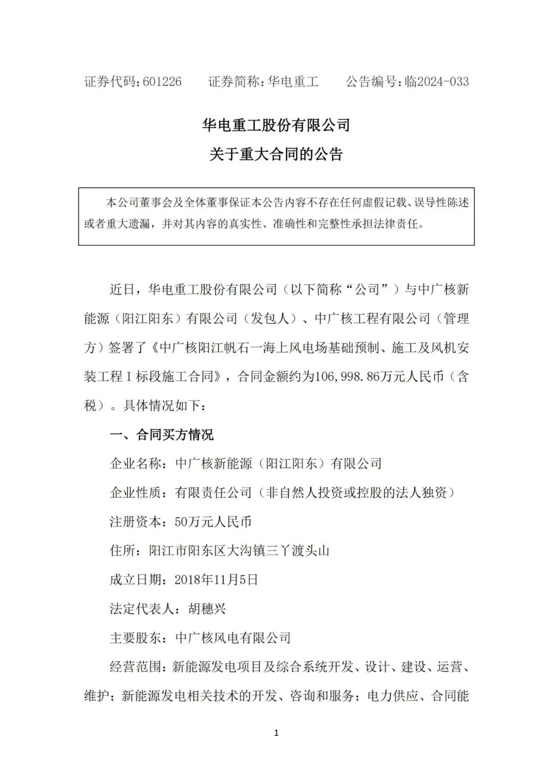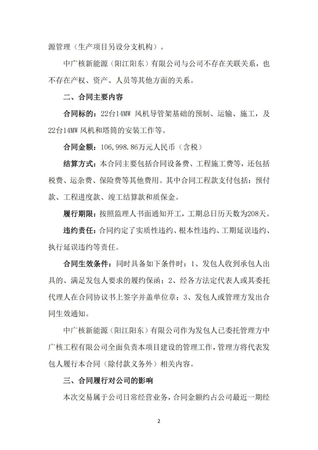 公告称,近日,华电重工与中广核新能源(阳江阳东)有限公司(发包人)、中广核工程有限公司(管理方)签署了《中广核阳江帆石一海上风电场基础预制、施工及风机安装工程I标段施工合同》,合同金额约为106,998.86万元人民币(含税)。合同标的包括22台14MW风机导管架基础的预制、运输、施工,及22台14MW风机和塔筒的安装工作等。