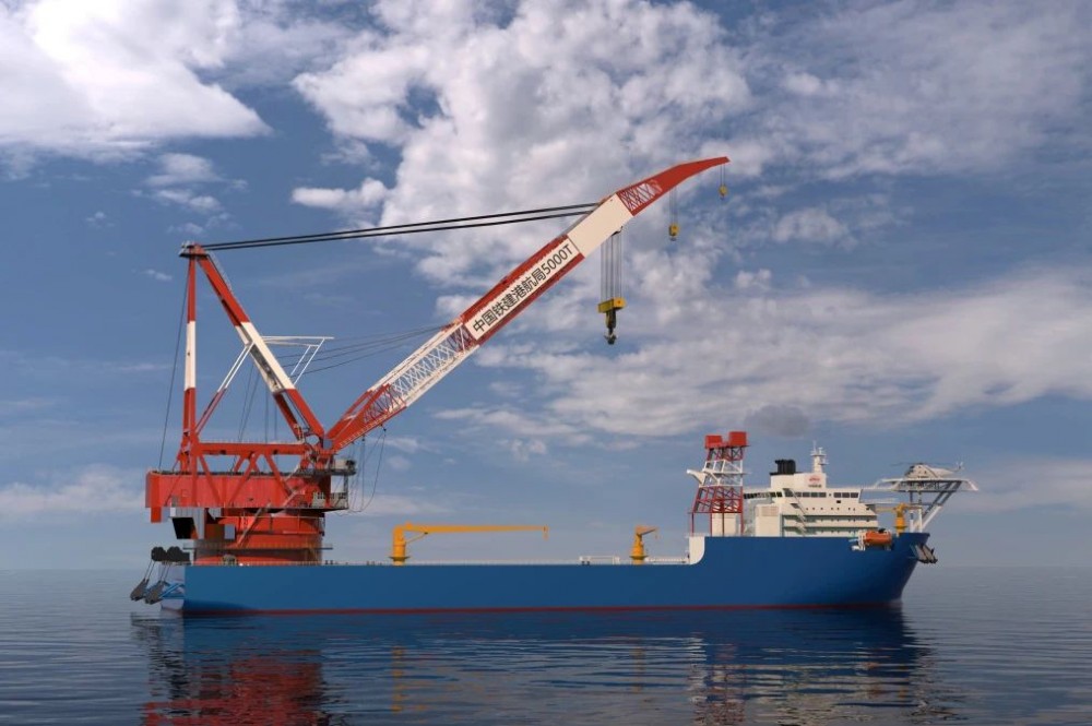 “铁建起重5000”是一艘集运输、起重、吊装以及风电安装等多种强大功能于一体的自航式全回转起重船,总长203米,型宽50米,型深18米,最大吊高可至甲板以上130米,在进行起重作业时,排水量可达11万吨,几乎等同于3艘中型航母的重量。主甲板堆货区面积约为6000平方米,均布载重能力达15吨/平方米。该船采用先进的全电力驱动模式,搭载国内首制的闭环动力定位高压配电板与功率管理系统,同时配备DP2级动力定位系统,航速可达到9节以上。船艉配备1台全回转变幅式起重机,主钩起重能力达5000吨,全回转起重能力可达3500吨,采用单钩“四爪钩”设计,是国内首例单钩吊重达到5000吨的起重船舶。