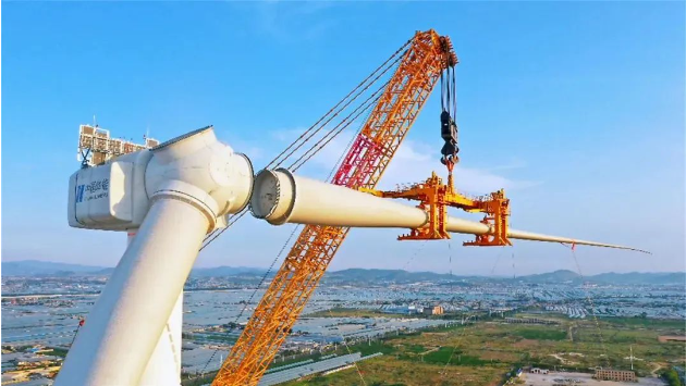 该18兆瓦风电机组,风轮直径260米、轮毂中心高度145米,机舱净重约500吨。特别是126米长叶片的安装就像一场高空穿针引线,需要在近150米的高空,将170多颗螺栓精准插入轮毂对应的孔内,过程中因为海风的影响叶片还会晃动,稍不注意就会受损,吊装难度极大。