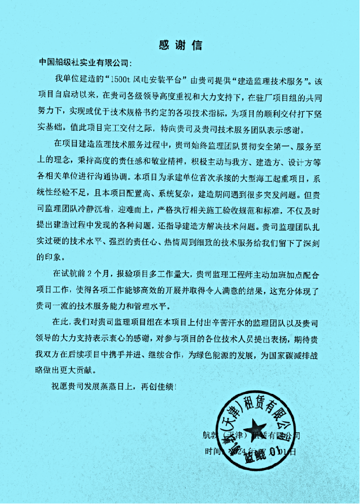 6月30日,中国船级社实业有限公司青岛分公司负责监理的“蓝鲲01”1500t风电安装平台交付仪式在中国石油海洋工程(青岛)有限公司码头隆重举行。她即将从这里拔桩启航,乘风破浪,开赴作业场地,从此开启新的篇章并向党的103岁生日献礼!