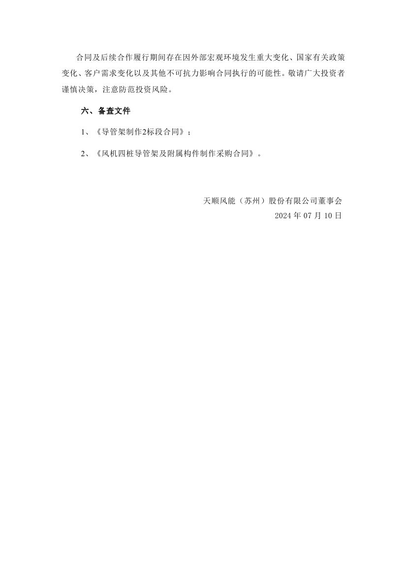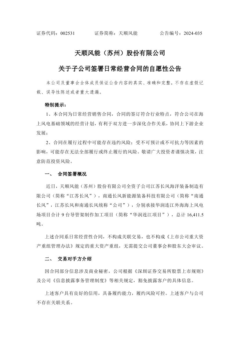 近日,天顺风能公告称,其全资子公司江苏长风、南通长风分别承接华润连江外海海上风电场项目合计9台导管架制作加工项目,总计 16,411.5 吨。