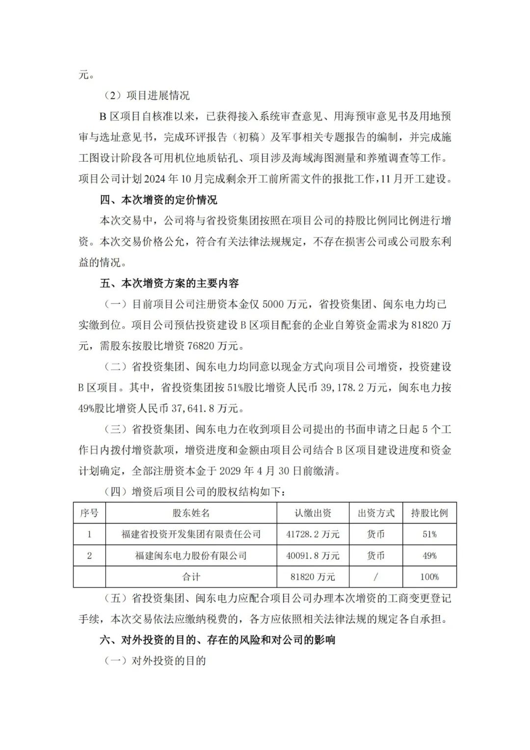 公告称,福建闽东电力股份有限公司拟与福建省投资开发集团有限责任公司拟按各自持股比例对霞浦闽东海上风电有限公司进行增资投资建设宁德霞浦海上风电B区项目。霞浦闽东海上风电有限公司预计需出资81820万元用于本项目投资建设,其中闽东电力按49%股比需出资40091.8万元(已出资2450万元,需增资37641.8万元)。