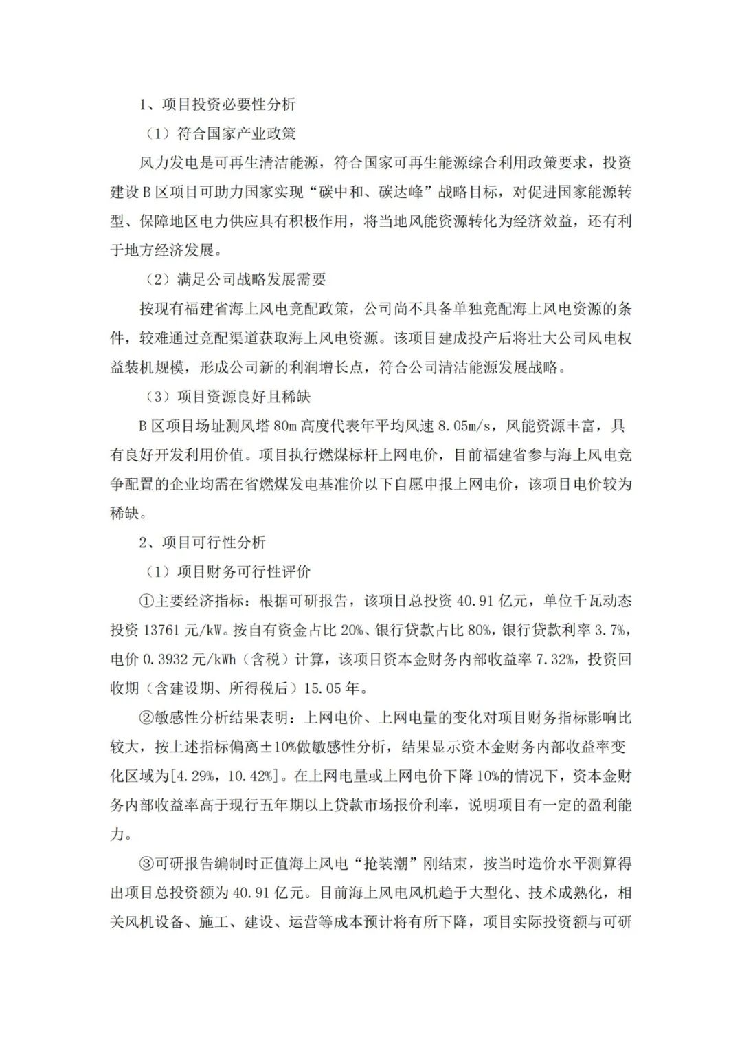 根据福建省水利水电勘测设计研究院有限公司及福建永福电力设计股份有限公司联合编制的项目可研报告,项目装机容量296MW,拟安装37台8MW 风机,项目总投资40.91亿元,运营期25年,建设期限24个月,等效满负荷小时数3600h,上网电价按目前福建省燃煤标杆上网电价0.3932元/kWh,建成投产后年上网电量106560万 kWh,年销售收入37449.9万元,年利润总额10380.58万元。