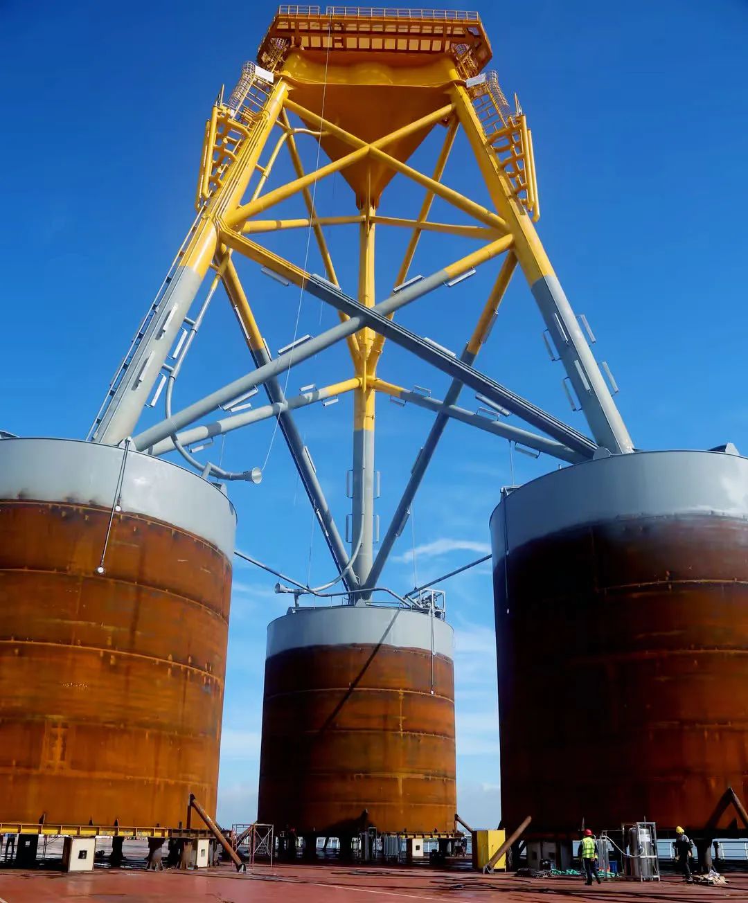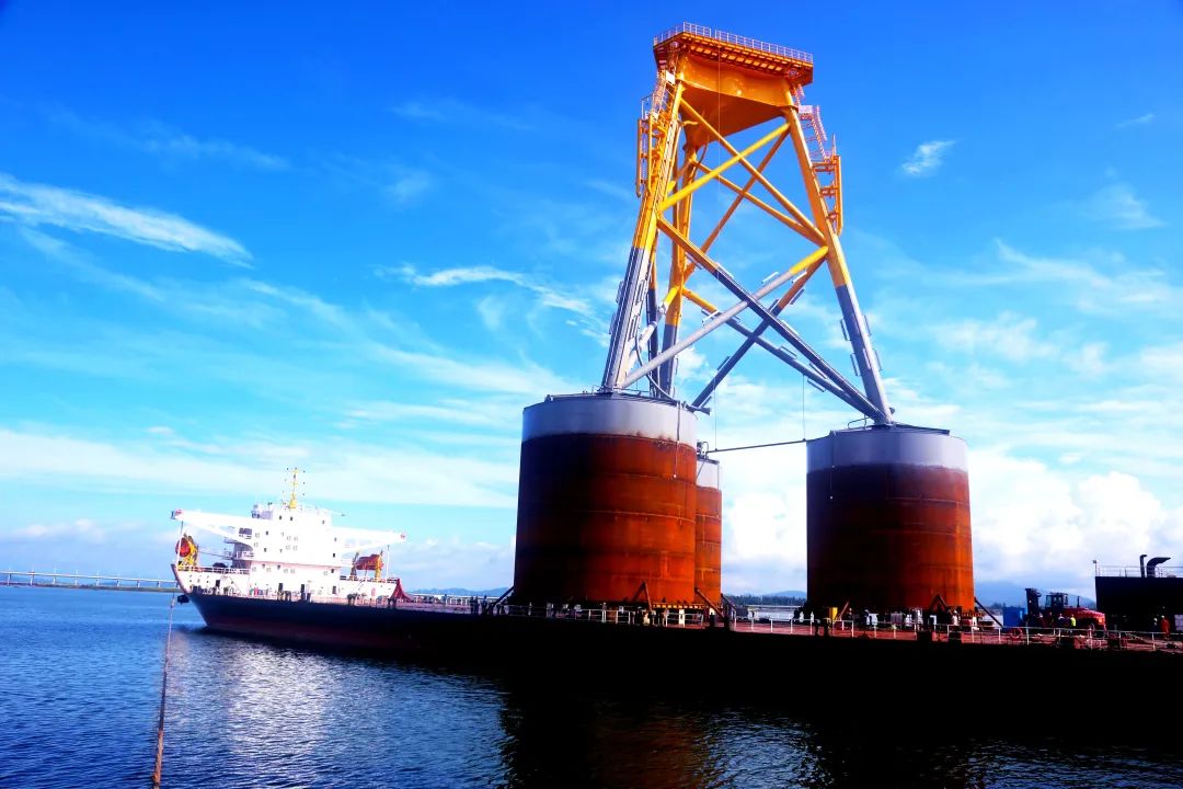7月12日,由阳江公司承建的三峡沙扒海上风电吸力桶导管架基础顺利发运,该导管架总重量为2148吨,总高61.5米,吸力桶直径16米,导管架型宽最大46米,为国内直径最大,重量最重的吸力桶导管架。