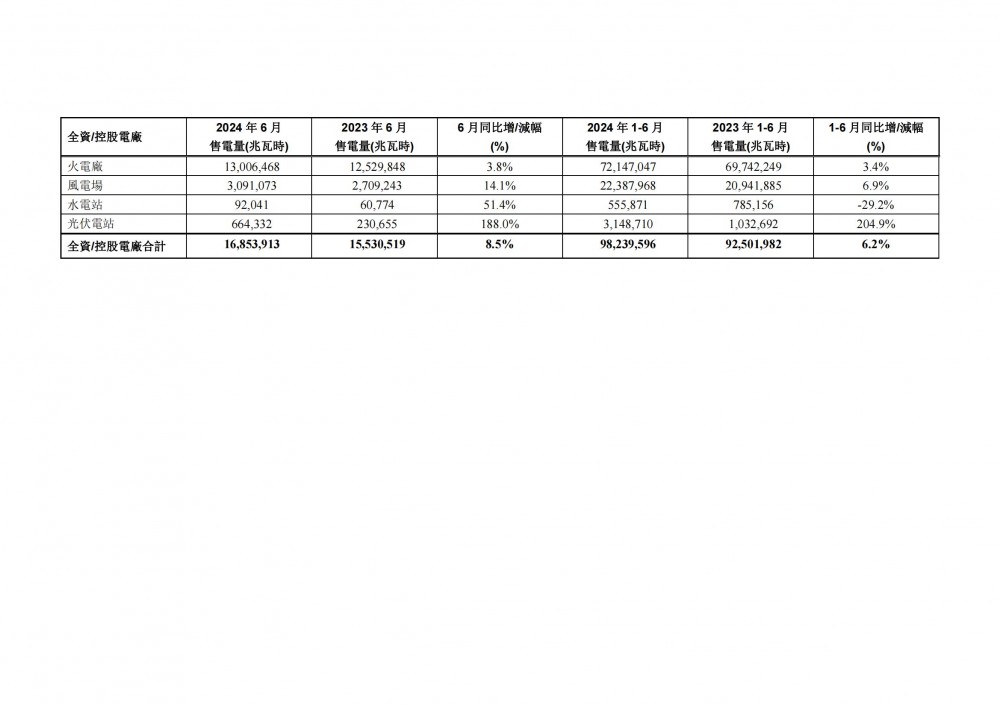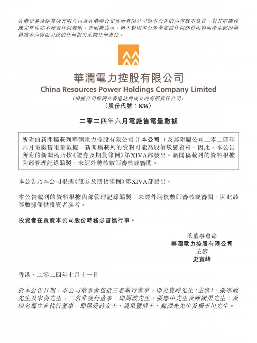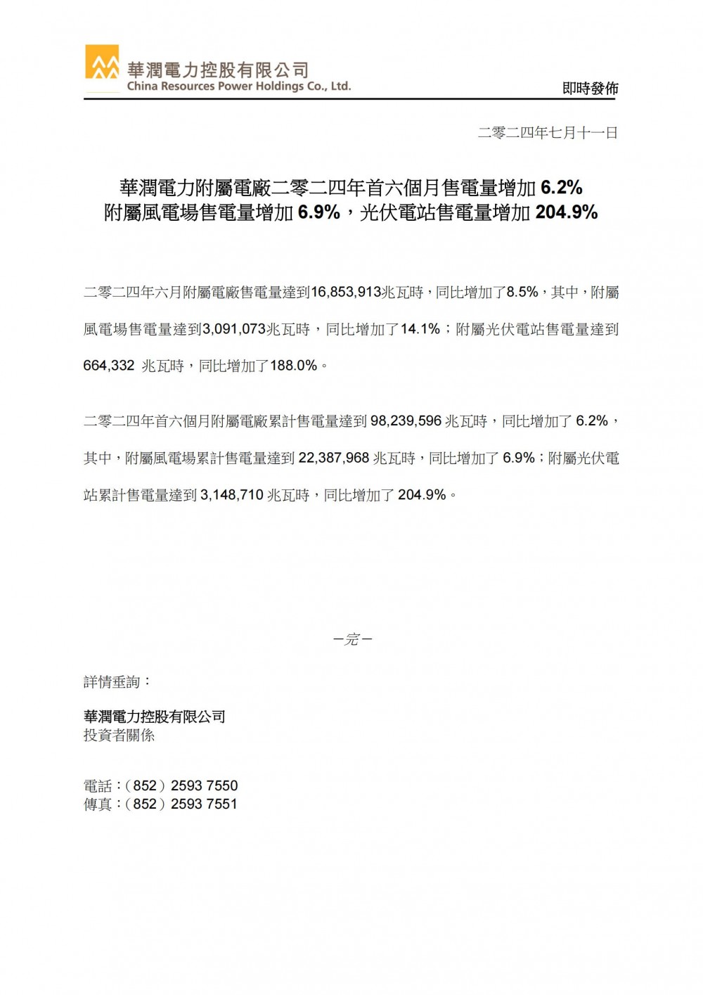 近日,华润电力发布二零二四年六月电厂售电量数据。