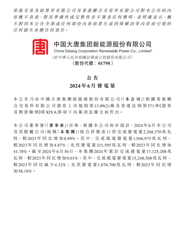 近日,大唐新能源发布2024年6月发电量。