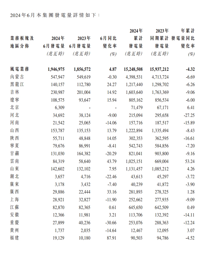 截至2024年6月30日,该集团2024年累计完成发电量约1712.52万兆瓦时,较2023年同比增加0.01%。其中,完成风电发电量约1524.85万兆瓦时,较2023年同比减少4.32%;光伏发电量187.67万兆瓦时,较2023年同比增加58.19%。